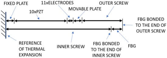 When a voltage is applied between the PZT electrodes, all the PZT rings will expand their thickness, as shown in Equation (7). The displacement will be transferred to the FBG through the screws where the FBG is bonded. Then, we have: