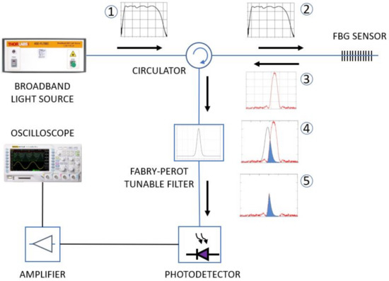 The numbered squares in Figure 4 represent the spectrum of the signal as it travels through the different components of the demodulation setup. The broadband light source (Model ASE730, Thorlabs, Newton, NJ, USA) generates a large-spectrum signal on the telecom Band C (1). The signal crosses the circulator (2) and illuminates the FBG (made in our laboratory by Nd-YAG laser), which reflects its Bragg wavelength (3). The Bragg wavelength reaches the Fabry-Perot filter, which is tuned to the center of the trailing slope of the FBG reflected spectrum (4). The effect of this filtering is a convolution of both spectra, represented by their superposition shown in blue (5), which is directed to the photodetector. As the PZT expands and contracts due to the applied electric field, the convolution area changes, feeding a variable optical power into the photodiode, therefore converting the FBG displacement peak into an amplitude modulated signal that is seen at the oscilloscope.