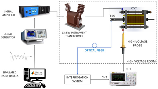 An oscilloscope (Model DS1102CA, Rigol, Suzhou, China) with a high-voltage probe with an attenuation of 1:1000 (Model HV40A, Minipa, São Paulo, Brazil) was used to measure the input signal applied to the OVT. The set with the elevator transformer, the OVT and the high voltage probe was isolated into a high voltage room in order to guarantee the protection of the experiment and operators. The optical fiber from the FBG brings to the interrogation system (see Figure 4) the OVT response to the applied disturbances.