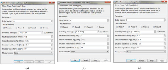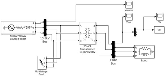 Three different phenomena were simulated: sag, swell and interruption. Figure 6 shows the model created in MATLAB/Simulink to simulate the disturbances and Figure 7 shows the type of fault for each one. Voltage sag is caused by a phase-to-earth fault of a 13.8 kV distribution line. Single-phase faults generate low voltage sags; however, they are unbalanced and asymmetric. Voltage swell is caused by a phase-to-phase fault with a high fault resistance, while the interruption is caused by a phase-to-phase-to-earth short circuit.