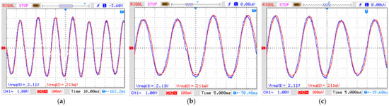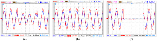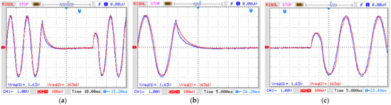 Simulated short-duration voltage as seen from input and output of the amplifier. (a) Sag, (b) swell and (c) interruption. Blue line: input signal from signal generator to amplifier; Red line: output from amplifier (see Figure 5). In all graphs: vertical axis with 2 V/div and horizontal axis with 10 ns/div.