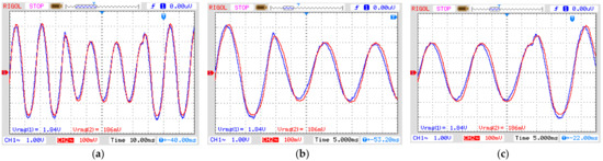 Figure 8 shows the signal generator output voltage (CH1) and the signal amplifier output voltage (CH2) for each disturbance. They were applied for three cycles, which is equivalent to a short-duration voltage variation known as instantaneous for sag and swell, ranging from 0.5 to 30 cycles, and momentary for interruptions ranging from 0.5 cycles to 3 s, according to the standard IEEE 1159 (see Table 2). The adequate reproduction of the input signal to the output by the amplifier is guaranteed by its frequency range, from 20 Hz to 20 kHz, and a harmonic distortion <0.05%.