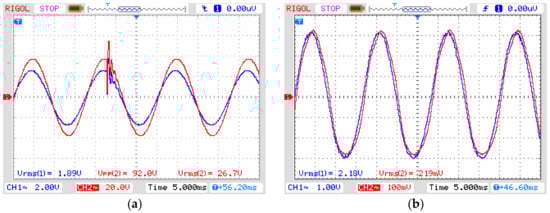 Impulsive transient disturbance. (a) CH1: input signal from signal generator to amplifier, CH2: amplifier output voltage (vertical axis: 2 V/div (CH1) and 20 V/div (CH2), horizontal axis: 5 ms/div); (b) CH1: OVT input voltage, CH2: OVT output voltage (vertical axis: 1 V/div (CH1) and 100 mV/div (CH2), horizontal axis: 5 ms/div).