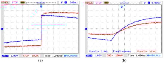 Step response. (a) CH1: input signal from signal generator to amplifier, CH2: amplifier output voltage. Vertical axis: 1 V/div (CH1) and 10 V/div (CH2). Horizontal axis: 1 ms/div; (b) CH1: OVT input voltage, CH2: OVT output voltage. Vertical axis: 1 V/div (CH1) and 200 mV/div (CH2). Horizontal axis: 1 ms/div.