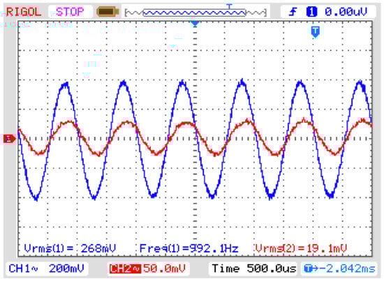 OVT input (CH1) and output (CH2) voltage for a 1 kHz sine wave. Vertical axis: 200 mV/div (CH1) and 50 mV/div (CH2), Horizontal axis: 500 µs/div.
