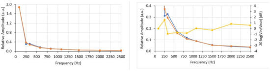 Figure 17 (right) also shows the OVT’s response in decibel (dB) (yellow line). In all frequencies up to 2.5 kHz, the response does not reach the −3 dB point, which means that the cut-off frequency lies above 2.5 kHz. The conclusion is that, although the cut-off frequency was not detectable, the OVT is capable to reproduce at least up to the 41st harmonic without distortion