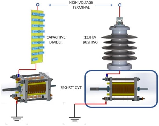 In the case of the proposed OVT, it is also necessary to lower the input voltage, but as the PZT stack has its own capacitance (see Table 1), the capacitor C2 and inductor L are not necessary; it is just a case to add another capacitor in series to perform a divisor. This capacitor, however, has to withstand 4 kV in order to allow another 4 kV to be applied to the OVT. To create such a high voltage capacitor, it is necessary to connect several 400 V rated capacitor in series, as shown in Figure 19 (Left). Then, the assembly is housed inside a 13.8 kV bushing, whereas the OVT is protected inside an IP65-rated casing, as shown in the illustration of Figure 19 (right).
