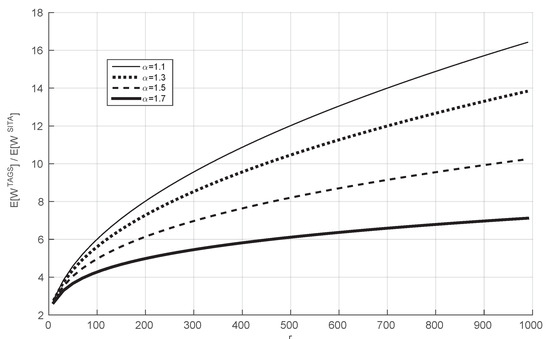 In Figure 3, we consider an arrival rate of , and we plot the ratio between the mean waiting time of the TAGS system and that of the SITA system when we vary r for several values of larger than one. We observe that the performance ratio under study is increasing with r for the considered values of r. Therefore, this illustration shows that the result of Theorem 1 generalizes to values of which are not equal to 1.