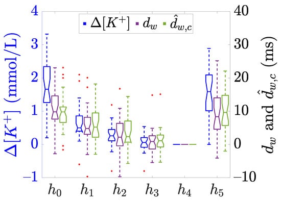 which for positive values of the marker, , implies , , , , , and . The case with is anecdotal, see Figure 2, and most likely is due to outliers, since they do not follow physiological interpretations of T-wave narrowing with increased potassium.