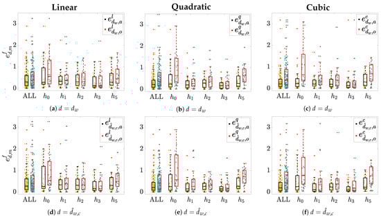 Boxplots in Figure 4 show the estimation error distributions, sorted by hours , using the linear (Figure 4a,d), the quadratic (Figure 4b,e), and the cubic (Figure 4c,f) models. In addition, the aggregated distribution for all hours is presented with the label (ALL). The widest error distributions are obtained for hours and , whose median and IQR are given in Table 1. These time points are of great interest since: (i) The samples are the furthest from the reference () and (ii) when they are estimated by using the leave-one-out (m = o) approach they do not have any temporarily close samples before (i.e., in case of ) and/or after (i.e., in case of ) as opposed to , , and ; this together with the fact that their associated marker values are also the farthest from the rest, Figure 2. Therefore, it seemed worthy performing a detailed hour-based error analysis.