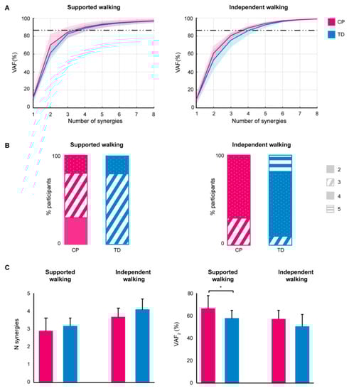 Bilateral EMG analysis results. (A) Mean variability accounted for (VAF) ± SD, per synergy 1–8 for the cerebral palsy (CP) and typically developing (TD) group, for supported walking (left) and independent walking (right); (B) Percentage number of synergies per group (n = 10) based on a VAF threshold of 85% or added VAF < 8% for the CP and TD group, for supported (left) and independent walking (right); (C) Mean number (N) of synergies (left) and variability accounted for (right) by two synergies (VAF2) for the CP and TD group, for supported walking and independent walking. Error bars indicate SDs, * p < 0.05.