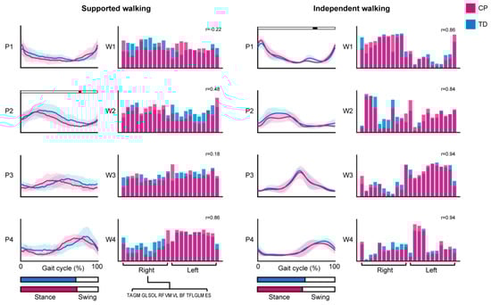 Mean activation patterns and synergy weights for a fixed number of four synergies. Bilateral EMG analysis results of the cerebral palsy (CP) and typically developing (TD) group, for supported walking (left) and independent walking (right). Lines show the mean temporal activation patterns (P) ± SD along the gait cycle, with mean stance and swing phase indicated by bar graphs at the bottom. Synergy weights (W) for the recorded muscles are depicted in a bar graph. Significant differences between activation patterns are indicated by the black bars, p < 0.05. Pearson’s correlations coefficients (r) between mean synergy weights of the CP and TD group are given. Abbreviations: TA = tibialis anterior; GM = gastrocnemius medialis; GL = gastrocnemius lateralis; SOL = soleus; RF = rectus femoris; VM = vastus medialis; VL = vastus lateralis; BF = biceps femoris; TFL = tensor fascia latae; GLM = gluteus maximus; ES = erector spinae at L2 level.