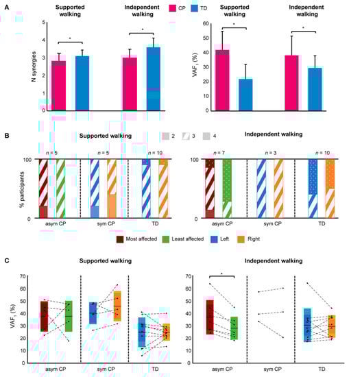 The aim of this study was to assess whether neuromuscular control in young children with CP differs from that of TD children with the same walking ability in the early phase of motor development, i.e., before the onset of independent walking (supported walking) and just after the onset of independent walking in particular by means of the contributing muscle synergies. In addition, we examined whether there was a difference in neuromuscular control between the most and least affected side of children who were affected asymmetrically (unilateral or asymmetric bilateral CP). We hypothesized that already before or during the first years of independent walking, children with (high risk of) CP recruit fewer synergies compared to TD children and that this is specific to the most affected side in children with asymmetric CP.