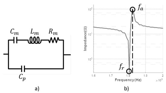 These quantities can be derived from the Butterworth Van-Dyke (BVD) equivalent circuit models [14,15]. The BVD circuit model is shown in Figure 1a. The value of the circuit elements can be derived from the simulated or measured impedance response of the design by solving the following expressions for the resonance and anti-resonance frequencies [16,17]: