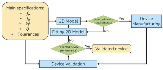 Current and conventional methodology for AWR design based on 2D simulation is shown in Figure 2. First, the Main specifications are provided depending on the device application and target performance. Then, a 2D model is proposed and analyzed using analytic equations and/or FEM simulations. The 2D design is adjusted/optimized until it fulfills the requirements. 2D modeling is capable to capture manufacturing tolerances. Unfortunately, the main drawback of this approach is that fabrication process defects as scalloping, slanting or undercut cannot be fully taken into account in the 2D design simulation process [26]. This is partly due to the inability of the 2D analytic formulas and FEM models to capture most realistic details of device fabrication as model variations in x, y and z directions generated by these defects. Consequently, in many cases, it is necessary to run several fabrication cycles to arrive at a final design in what is referred to as Device Validation in Figure 2.