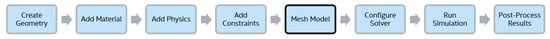 Moreover, Figure 4 shows additional details about the steps taken to solve problems using 2D or 3D Finite Element solvers. In this process, a set of configurations must be completed in order to properly replicate the device conditions as material properties, single physics or multi-physics interaction, boundary conditions, proper solver, and mesh size definition. In this process, the mesh study represents a challenge for designers, since an incorrect configuration can generate unreliable data.
