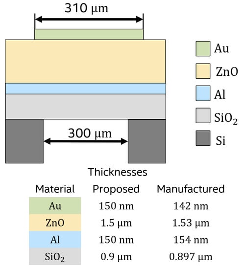 Figure 5 shows the dimensions of the proposed and fabricated design by the authors [11]. In particular, the thickness difference is of the order of 2.66% and 5.33% for the Al and Au layers, respectively.