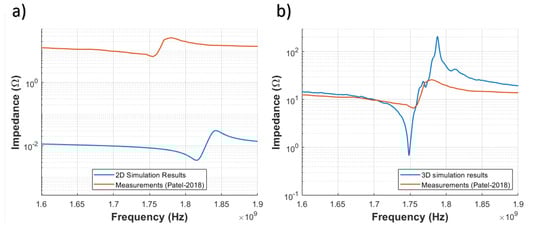 To validate the proposed methodology, the value of that results in an impedance response that best approximates the measured response is selected. Figure 12 and Figure 13 show the impedance response of the simulated device with and the measured response reported in Reference [11].