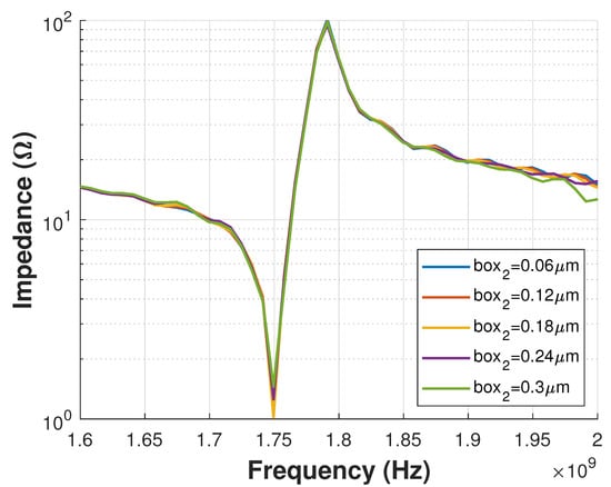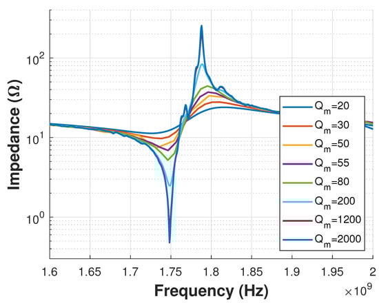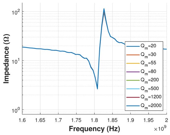 The sensitivity analysis presented in this paper highlights the importance of accurate knowledge of its value. It plays a more or less significant role depending on the type of the material (as shown in Figure 9 and Figure 10) and the frequency of interest (used to define the material properties). In the example shown in this paper, the of the Al material at the bottom electrode impacted more significantly the performance of the device than the gold material of the top electrode. Therefore, this analysis indicates that the best option for the designer in this case is to attempt to increase the of the Al film deposited for the bottom electrode. The stronger effect of the bottom electrode Al layer is likely due to its density being 7 times lower than the top electrode Au layer.