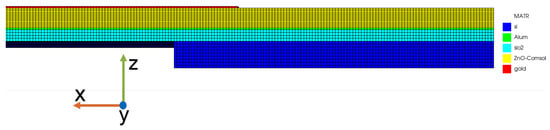 The 3D model was reduced to a 25% of the FBAR physical size, by applying symmetry conditions to the and planes. A mesh study was performed to discard variations due to inadequate discretization of the geometry. The target of the mesh analysis was to reproduce as close as possible the measured performance as reported in Reference [11]. Material properties for Al, Au, and ZnO were given as default from OnScale materials database since the paper chosen does not report any study related to their materials. In addition, the impedance boundary condition was configured to be automatically computed by the software for and planes. In contrast, a fixed boundary condition for plane was used and a free boundary condition for plane was set.