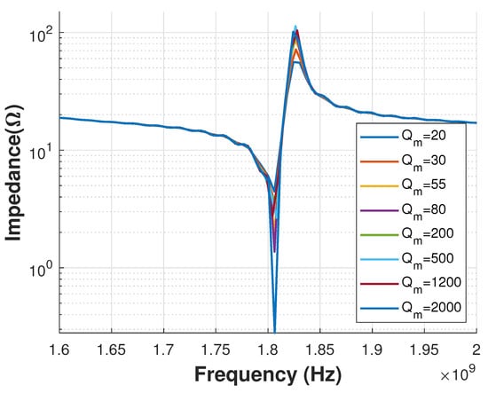 To summarize the above analysis, the Quality Factor of the device, its Coupling Coefficient , and its Figure of Merit were computed from Equations (3)–(5). This was done for the different values of the Material Quality Factor analyzed. Table 1 shows that increases with as expected. Yet, the value of the deposited material is usually not known exactly beforehand due to the above mentioned limitation of the measurement method.