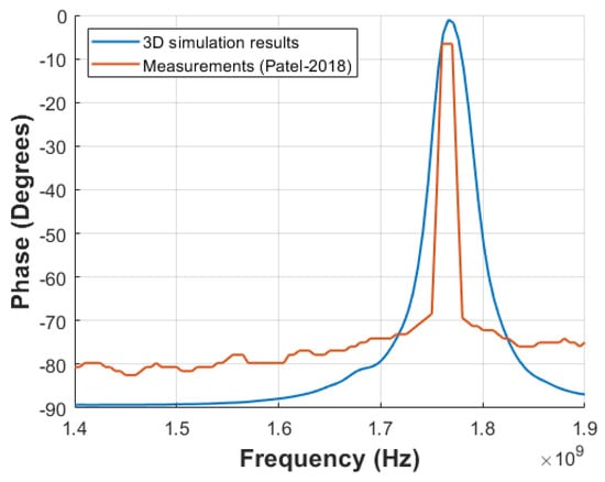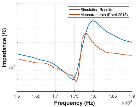 Figure 12 and Figure 13 show the comparison of the impedance response (magnitude and phase, respectively) between the simulations results () and the measurements from Reference [11]. As can be seen, there still exists a difference between the measured device behavior and simulation results. In the magnitude response, the maximum values for the measured and simulated results are 26.12 ohms and 37.2 ohms, respectively, as shown in Figure 12, whereas, in the phase response the maximum values for the measured and simulated results are -6.563 degrees and -1.019 degrees, respectively, as shown in Figure 13. Moreover, the values of FoM of the simulated and measured device deviate by less than 8%, as shown in Table 2.