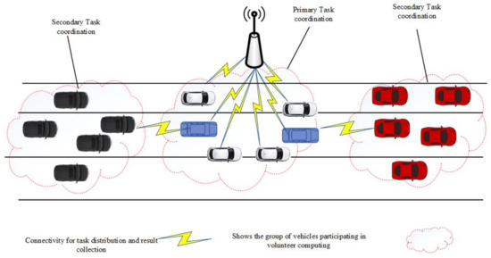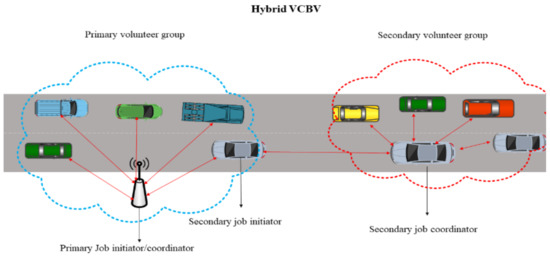 The scenario considered in this paper is of vehicles in congestion that voluntarily process tasks. The network model of hybrid VCBV can be explained in Figure 2. In the scenario, there is a primary job initiator/coordinator, a secondary initiator/coordinator and volunteers. The details are as follows: