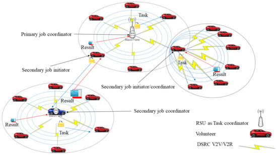Either the secondary job initiator obtains the willingness of volunteers in its communication range and acts as coordinator, or it forwards the task to another vehicle or an RSU which can then acts as a task coordinator. This type of coordinator is termed a secondary task coordinator and accumulates further volunteers, resulting in an increase in resource utilization and optimized makespan.