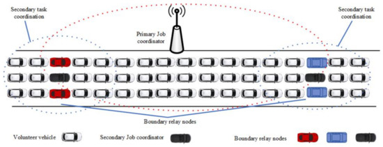 Boundary relay nodes from the volunteers can play the role of secondary job initiators to maximize resource utilization and minimize the makespan incurred during job execution. If the distance of vehicle from the primary job coordinator is larger than the distance between the coordinator and all other volunteer vehicles, then vehicle is termed to be a boundary relay node as shown in Figure 3. Let be the communication range of RSU and be the distance of vehicle and RSU. Node would the boundary relay node if is minimum positive value for all :
