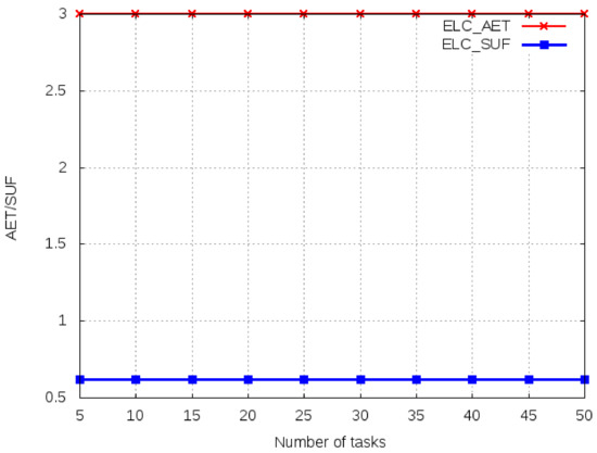 In this scenario, the size of the task is fixed at 1000 Kbits and the number of tasks varies from 10 to 50. We first, compute the average execution time and system utility function for ELC. The performance of ELC is taken as a benchmark for all other computing algorithms. In Figure 5, we observe the benchmark values for average execution time and system utility. Any task with a higher average execution time than ELC will be rejected for offloading for any of the computing algorithms. Task execution time increases with an increase in the number of tasks, but average execution time remains constant for several tasks due to the fixed computation requirements and similar OBU types.