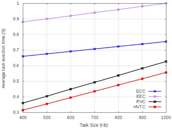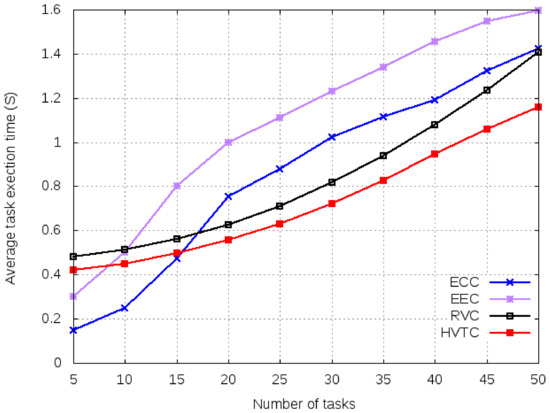 It is observed in Figure 6 that the average execution time for a small number of tasks is lower when using cloud or edge mechanisms over VCBV algorithms. The reason for this good performance is due to the higher computation resources of cloud and edge computing than the OBUs within vehicles. As the number of tasks increases, the performance of ECC and EEC decreases due to communication and computation constraints. Both RVC and HVTC use volunteer computing for resource allocation but differ in the number of hops. HVTC shows better performance than RVC. The reason behind this is better resource allocation in HVTC, due to multi-hop communication. Even for a smaller number of tasks, HVTC uses three times more resources. It uses the same number of volunteers as is used in RVC, only in primary coordination. Using a multi-hop resource allocation increases the number of volunteers resulting in lower computation time. This technique optimizes the makespan but occupies more communication resources during the offloading process.