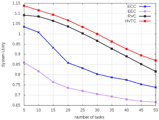 Figure 7 shows the simulation results of the system utility function for computing algorithms for a varying number of tasks. The system utility of any computing algorithm depends on the makespan and cost paid to third party vendors such as cloud and edge provision. The lower the makespan and monetary cost, the higher the system utility of the algorithm. The reason to use system utility for comparison is to highlight the importance of free of cost computing services. RVC and HTVC have better performance and higher system utilities comparing to ECC and EEC because RVC and HTVC use volunteer computing and charge no monetary cost.