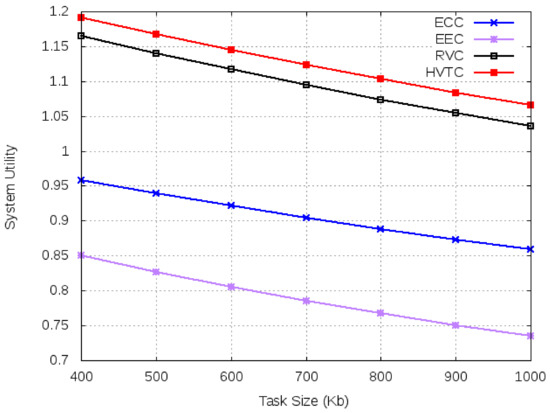 For simulations, we fix the number of tasks at 20 and vary the task input data size from 400 Kb to 1000 Kb. From Figure 10, it can be observed that EEC and ECC have higher average execution time compared to volunteer computing-based algorithms. An increase in the number of tasks affects the performance of edge and cloud due to increase communication and computation requirements. However, a task with a smaller input size has a lower execution time. According to Figure 11, ECC and EEC have smaller system utility compared to volunteer computing-based algorithms.