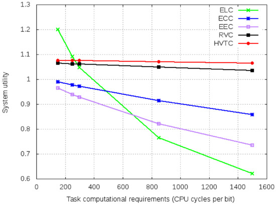 Figure 13 shows the system utility values for varied task computational requirements. ELC shows better system utility because it does not involve offloading and monetary costs. Even with lower computational capabilities, it shows better performance for tasks with low computational requirements. HVTC has the highest system utility except for the task with computational requirements of less than 300 CPU cycles per bit. Like ELC it does not involve the monetary cost, but it has a communication cost for offloading.