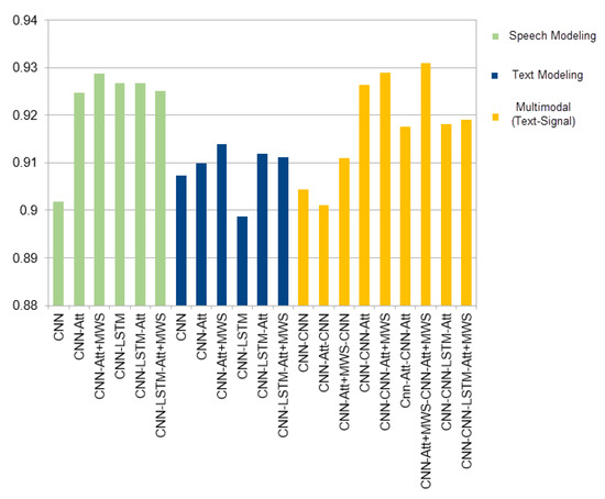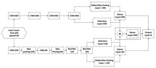 Many studies have been developed for deep-learning multimodal approaches [31,32,33]. In this study, merging the speech and text models are concatenated at the final layer for classification. The joint representation multimodal approach in [34] is applied to keep the speech and text features separated in the modeling process. Also, it gives a clear picture of the effect of using the multimodal compared with the same models trained alone. Figure 1 shows the dotted lines indicating the merging layer that combines the two speech and text models from the main branch. More specifically, different combinations of speech and text models are merged until achieving the best accuracy. Then, the five cross-validations and F1-scoring are applied for validation. In Equation (4), a merged dense layer concatenates the dense activation output from text and speech branches in Equation (9).