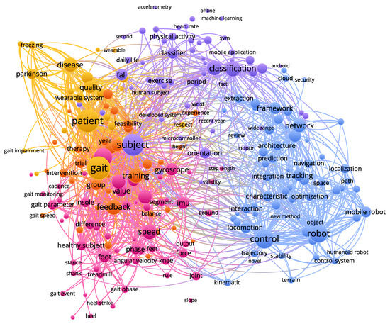 To establish an appropriate search phrase, a pre-search was carried out first, collecting a list of keywords used by gait analysis researchers. In an attempt to find an optimum keyword-combination from the list, we analyzed these keyword-combinations by taking the conducted search results (from Scopus) to VOS-viewer [34], a metadata analysis software. VOS-viewer performs clustering of search results based on title, abstract and keywords of corresponding articles and illustrates the results graphically as shown in Figure 1. This gives us a bigger picture of the nature of articles returned by the search engine for the corresponding choice of keywords. The size of each node indicates the relative relevance (based on the frequency of occurrence of keywords) of that topic among the list of articles returned by the search query. This procedure was iterated and refined several times before arriving at the final search phrase listed in Table 2. We believe that it made the decision-making less subjective and biased. Although this study is not limited to any particular wearable sensor, we included the keywords ‘IMU’ and ‘insole’ (see Table 2) explicitly so as not to miss out articles related to these two types of sensors, while also retaining the word ‘sensor’ in the search phrase to make it inclusive for every other type of wearable sensors.
