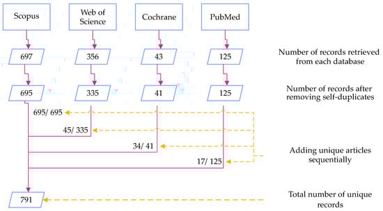 Collecting unique articles from the databases was carried out sequentially, starting with Scopus where 697 articles were extracted and of which 695 unique records were identified. Out of the 335 unique records identified from Web of Science, 290 articles already appeared in the results from Scopus and hence the remaining 45 unique records were added. Similarly, 34 from Cochrane and 17 from PubMed were added to the list of unique records.