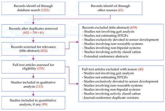 PRISMA flow diagram illustrating the screening procedure. Reasons for exclusion and the number of articles retrieved at each stage are indicated in red. In addition, 832 articles were left after removing duplicates. Out of those, 679 articles were eliminated through title-abstract screening, based on a set of exclusion criteria as listed in the PRISMA flow diagram. The remaining 153 articles qualified for full-text screening, of which 40 were excluded and the remaining 113 qualified for full-text review. Out of these, 99 articles were also used for quantitative analysis. ISTGF—intra-stride temporal gait feature.