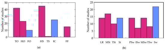 (a) Distribution of studies based on the detected gait events; (b) distribution of studies based on the gait phases identified. Gait events/phases reported with greater (temporal) specificity are shown in magenta while gait events/phases reported with less specificity are shown in blue. For instance, initial contact (IC, blue) is not specific as to whether the contact is with the heel or toe while heel strike (HS, magenta) and toe strike (TS, magenta). TO—toe off, HO—heel off, FO—foot off, HS—heel strike, TS—toe strike, IC—initial contact, FF—foot flat, LR—loading response, MSt—mid-stance, TSt—terminal stance, St—stance, PSw—pre-swing, ISw—initial swing, MSw—mid-swing, TSw—terminal swing and Sw—swing.