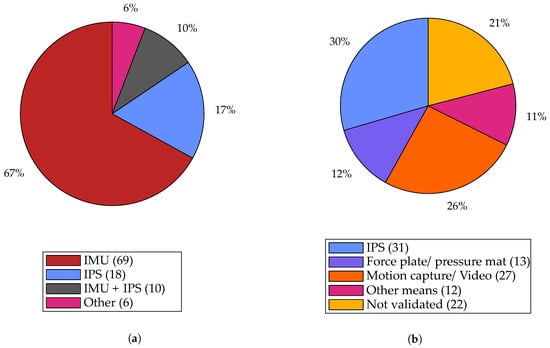 (a) Distribution of studies based on the type of wearable sensors used; (b) distribution of studies based on the type of sensors used for ground-truth validation of IMU-based gait analysis. Absolute number of studies in each category is listed within parentheses. IMU—inertial measurement unit, IPS—insole pressure sensor, EMG—electromyography sensor.