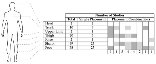 Number of studies using inertial measurement units (IMUs) that placed the sensor(s) on specific anatomical locations. Single placement contains studies where sensor(s) were placed only in one anatomical location. Placement combinations’ columns indicate studies where sensor(s) were placed in more than one location. Each relevant location is marked by a shaded cell and the number of studies using this combination is indicated at the bottom of the column. The total indicates the sum of studies where the sensor(s) were placed on that given anatomical location.