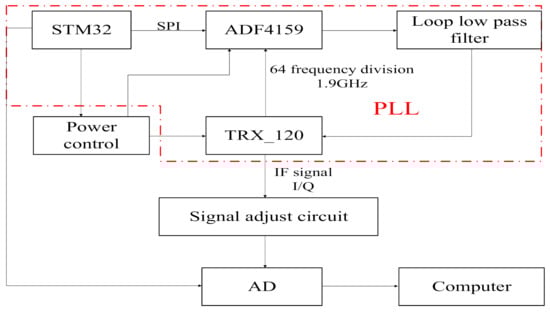 Vital signs monitoring radar sensor is featured with small size, low cost and high FMCW linearity. To satisfy these requirements, the 120 GHz integrated millimeter wave radar chip TRX_120 produced by the Silicon Radar Company is adopted as the radio frequency (RF) front end in this paper; a phase-locked loop (PLL) circuit composed of a frequency synthesizer chip ADF4159 and ARM core microcontroller STM32 is used to control millimeter wave voltage controlled oscillator (VCO) of the radar chip, thus achieving a radar front-end with a sweep bandwidth of 120–125 GHz and low power consumption (transmit power −3 dBm). Although the transmit power of the radar antenna is only −3 dBm, according to the radar equation and the reflection characteristics of human skin, the test distance of 1.5 m is much shorter than the unambiguous range of the radar, so the radar transmit power can meet the measurement requirements of human vital signs. The hardware structure of this vital signs monitoring radar is shown in Figure 1.