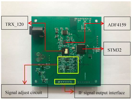 The IF signal of TRX_120 chip adopts the form of differential output, and when the measuring distance is within the range of 1.5 m, the frequency is dozens of kHz and the voltage amplitude maintains at mV level. Therefore, we set the sampling rate at 200 kHz, selected the low noise operational amplifier chip to form the differential amplifier circuit and the same direction proportional amplifier circuit to realize the amplification and filtering of the differential signal, so as to meet the input signal conditions of the data acquisition card, and make full use of the 16 bit sampling bits. The picture of the 120 GHz radar sensor is shown in Figure 2, and the size of the radar is 80 mm × 80 mm.