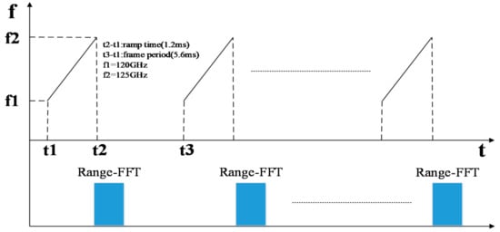 Once the radar is powered on, the IF signal passes through the direct-current (DC) isolation capacitor, low noise amplifier circuit and high pass filter, and is then collected and stored by AD and uploaded to the computer. The statistical results show that the normal frequency spectrum of a heartbeat signal is below 3 Hz [16], while the frequency of a respiratory signal is below 0.67 Hz. For FMCW radar, each chirp can obtain the phase information of a corresponding range unit after being processed. Since the phase is proportional to the displacement caused by respiration and heartbeat, each chirp can be regarded as a sampling of heartbeat and respiration signals. According to the Nyquist sampling theorem, the sampling frequency should be more than twice the maximum frequency of heartbeat and respiration so as to keep the oscillation information of respiration and heartbeat completely. Therefore, the frame period of each FMCW pulse was set as 5.6 ms and the duration of frequency ramp was 1.2 ms. Therefore the sampling frequency was 178 Hz, far greater than 3 Hz (heartbeat 180 times/min), which can meet the acquisition requirements of heartbeat and respiratory signals. The chirp configuration of FMCW radar is shown in Figure 3.