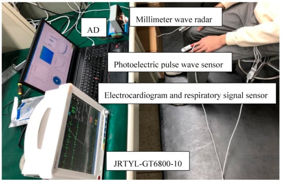 Eight male volunteers with a height of about 1.75 m and a weight of about 65 kg were selected as test objects. During the test, the person about to be tested sat in the chair at a distance of approximately 1.0 m in front of the radar; the heart position of the chest kept a basically vertical relationship with the main beam direction of the radar-transmitting antenna. The heart rate and respiratory rate were measured in the experiment. At the same time, the electrocardiogram (ECG), photoplethysmographic (PPG) pulse wave and respiratory signals measured by the JRTYL-GT6800-10 cardiovascular monitor were compared to verify the correctness of the results. Figure 5 shows the schematic diagram of the respiratory rate and heart rate measurement experiment.