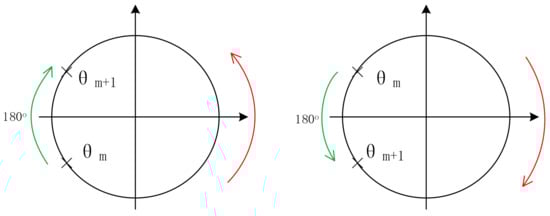 It can be seen that the IF signals obtained by using narrow beam antenna have no clutter interference. By selecting the spectrum peak corresponding to the human target we are concerned about, and then calculating the phase θ by using the real part and imaginary part of the frequency corresponding to the peak point of the spectrum, we can thus obtain a phase sequence θ(n) (n = 1, 2…, N) corresponding to the FMCW pulse. The chest displacement caused by breathing is sometimes greater than , so the phase sequence has a jump problem. For each pair of adjacent phase values (θ(m),θ(m + 1)), if θ(m + 1) − θ(m) > 180°, it indicates that θ(m + 1) > 0 and θ(m) < 0, θ(m + 1) = θ(m + 1) − 360°; if θ(m + 1) − θ(m) < −180°, which indicates that θ(m + 1) < 0, θ(m) > 0 and θ(m + 1) = θ(m + 1) + 360°. The phase jump process is shown in Figure 7, where the direction indicated by the green arrow is the correct direction in which the phase angle θ changes [17].