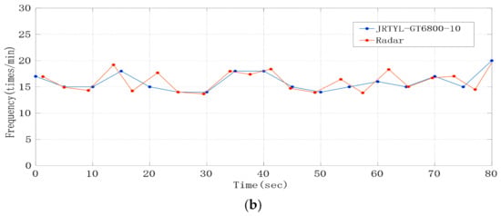 Through analyzing the phase sequence data, we found that the time domain waveform of the respiratory signal was relatively clear, and that there was a big difference in time length between different respiratory cycles. The frequency obtained by the FFT algorithm cannot fully reflect the characteristics of respiratory signals. Therefore, we used a Gaussian low-pass smoothing filter to extract the respiratory signal, and then determined the duration of each breath by looking for the waveform peak in the time domain. The filtered respiratory signal waveform is shown in Figure 9a. Taking the time difference between adjacent peaks in the waveform as abscissa and 60/ as ordinate, the curve of respiratory rate (times/min) changing with time is drawn as shown in Figure 9b. Compared with the respiratory rate displayed by the JRTYL-GT6800-10 cardiovascular monitor, the error was within ±2 times/min except for individual scatter points, which was caused by the difference of the time domain waveform feature extraction standards between the two instruments.