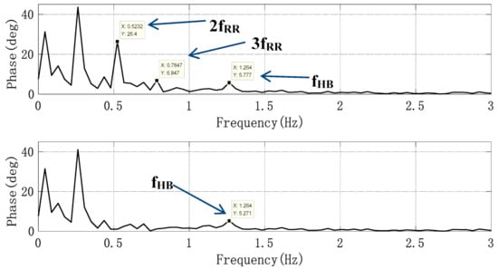 As the phase sampling rate was 178 Hz, the FFT frequency resolution of 4096 sampling points was 0.0435 Hz. When the frequency of signal was not a positive integer multiple of FFT frequency resolution , the spectrum leakage caused by the FFT “fence effect” greatly reduced the accuracy of frequency estimation. For example, for a heart rate assessment in 60 s, the maximum error could be 1.3 bpm. Therefore, we modified the heart rate obtained by the FFT by the adjacent element proportion of spectrum peak method [20]. The specific method is shown in reference [20]. Finally, the heart rate obtained was as follows: