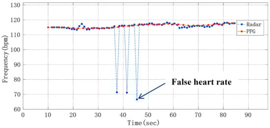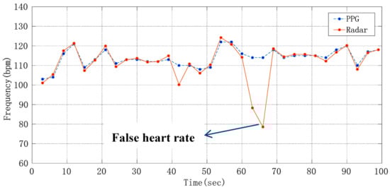 where HRref is the heart rate obtained from the number of peaks in the pulse wave, and HRradar is the heart rate obtained from the raw phase data through the ANF and FFT algorithm and frequency correction by using radar sensor. In Figure 12, after being processed by an extraction algorithm with the Doppler radar signal and PPG reference signal, respectively, the heart rate detection results of a volunteer whose heart beats too fast were compared, where the heart rate average was 22.94 s. It can be seen that although the heart rate differed from one subject to another, this method can detect the heart rate more accurately.