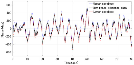 From the raw phase sequence data in Figure 8, we can see that the waveform contour of the respiratory signal is obvious, so we use the method of taking the middle line of the upper and lower envelope lines of the raw phase sequence data waveform to remove the respiratory fundamental wave. Figure 13 is the schematic diagram of obtaining the raw phase sequence data envelope.